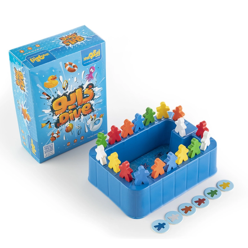 اقلام بازی فکری دایو رو از جعبه بیرون میاریم و زمینهی کف استخر رو در جای خودش قرار میدیم. بدون نگاه کردن به اعداد زیر مهرهها، هر مهره رو تصادفی روی خونههای لبهی استخر میگذاریم. شش توکن بازی رو بُر میزنیم و به هر نفر یک توکن میدیم تا هر بازیکن مخفیانه رنگ توکن خودش رو ببینه.