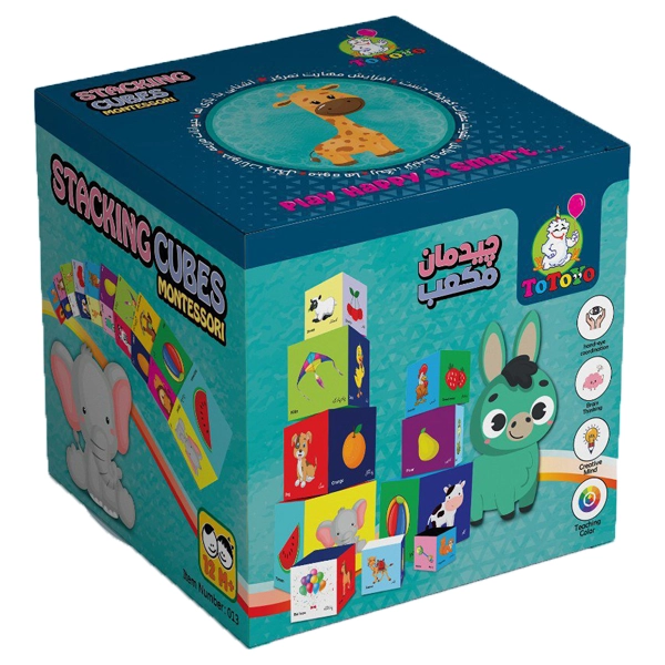 برج مکعب توتویو شامل 10 مکعب از جنس مقوای سخت در 10 اندازه مختلف است که به کودک کمک میکند تا با روی هم چیدن مکعبها، ضمن تقویت ماهیچههای ظریف دست خود، مفاهیم متنوعی را فرا بگیرد.