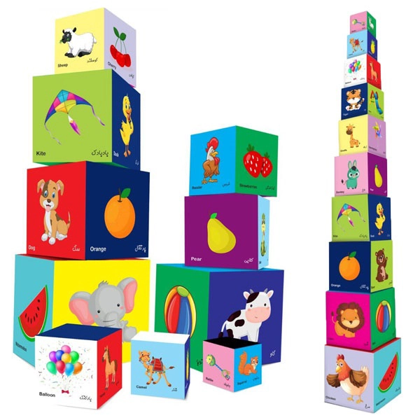 در وجوه مختلف هر مکعب رنگ ها، حیوانات اهلی، حیوانات وحشی، میوهها و سبزیجات با نام فارسی و انگلیسی آنها آمده است تا کودک با نام آنها آشنا شود.